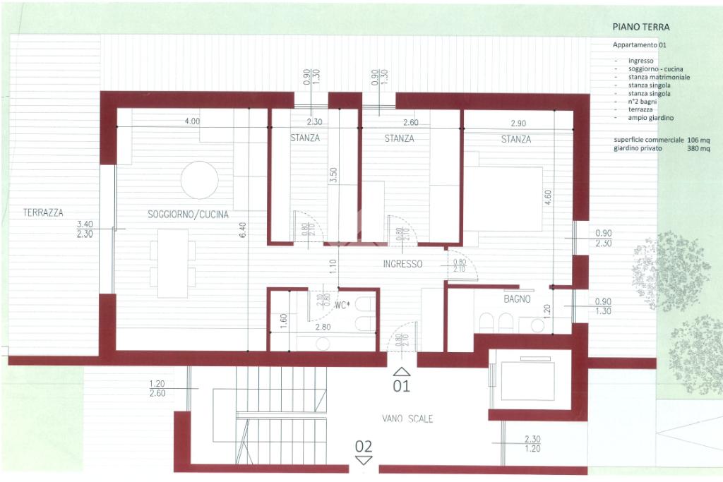Situato al piano terra, l'immobile si estende su una superficie di 105 mq e offre un giardino privato, ideale per momenti di relax all'aperto.